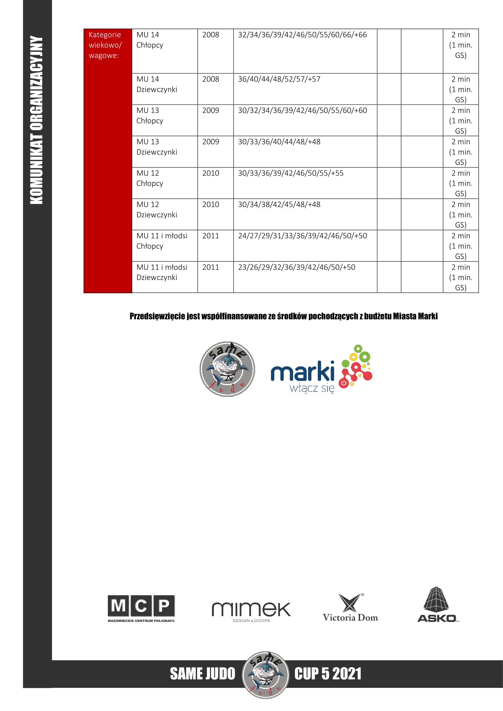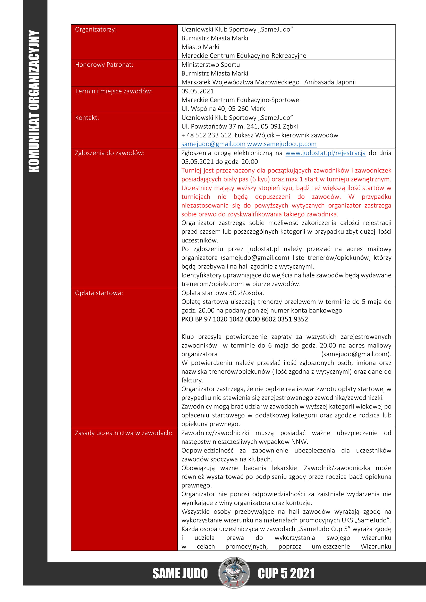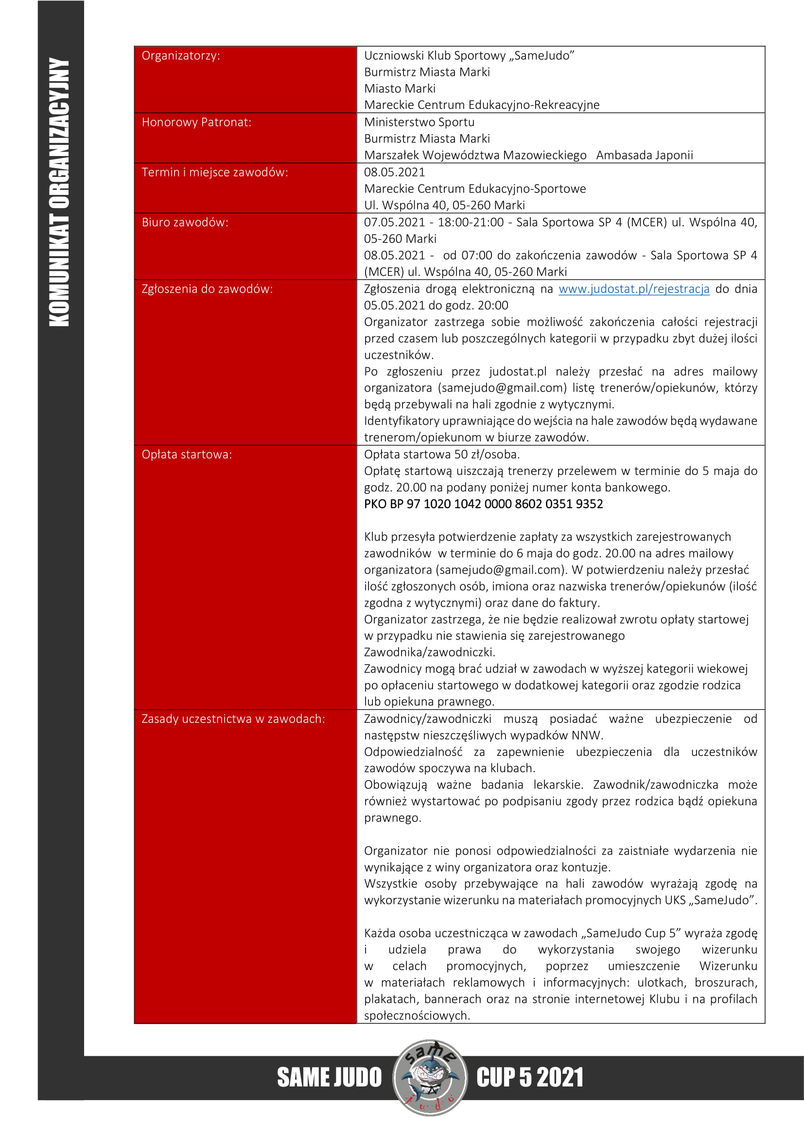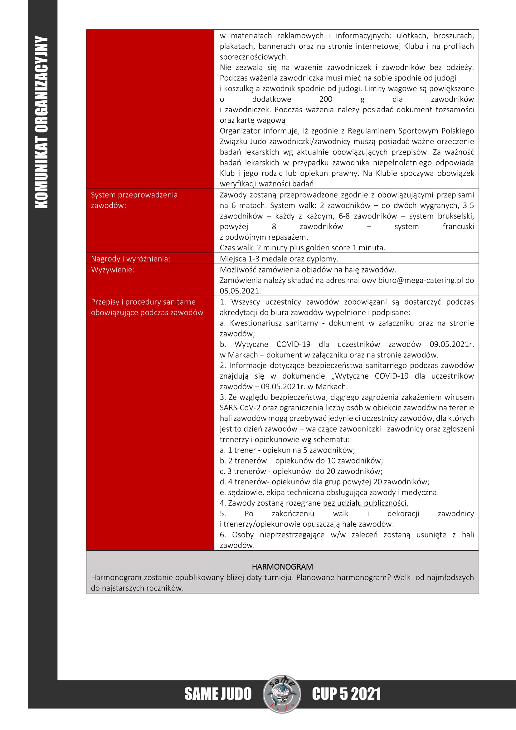 Niezbędne dokumenty: zgoda rodzica oraz kwestionariusz sanitarny. Dokumenty do pobrania ze strony organizatora: https://www.samejudocup.com/harmonogram