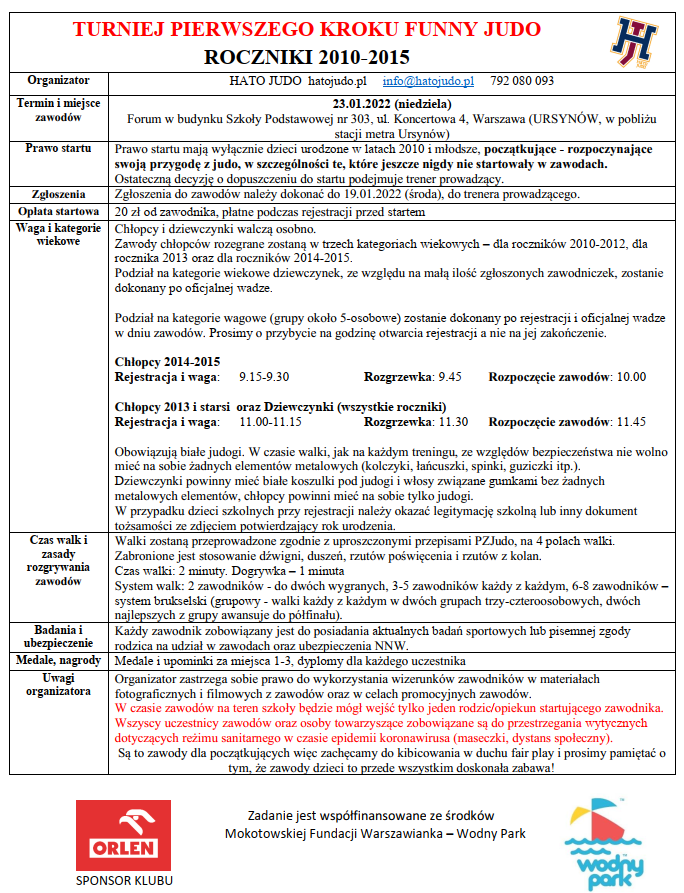 serdecznie zapraszamy do udziału w wewnętrznym Turnieju Pierwszego Kroku, który skierowany jest do dzieci z roczników 2010-2015, początkujących – rozpoczynających swoją przygodę z judo, w szczególności te, które wcześniej jeszcze nie startowały w zawodach.