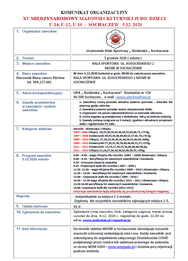 XV MIĘDZYNARODOWY MAZOWIECKI TURNIEJ JUDO DZIECI SOCHACZEW 5.12. 2020