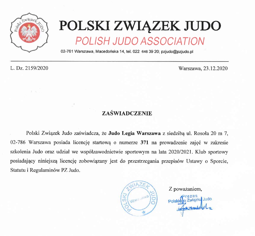Klub Judo Legia Warszawa jest członkiem Polskiego Związku Judo i posiada aktualną licencję  na prowadzenie szkolenia i współzawodnictwa sportowego, niezbędną do realizowania zajęć w czasie ferii, zgodnie z obowiązującymi przepisami.